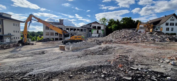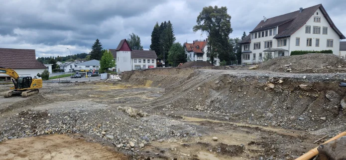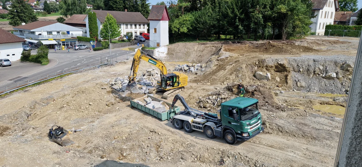 Dahinter weichen die grossflächigen Industriebauten zwei Mehrfamilienhäuser und 2 Reiheneinfamilienhäuser.