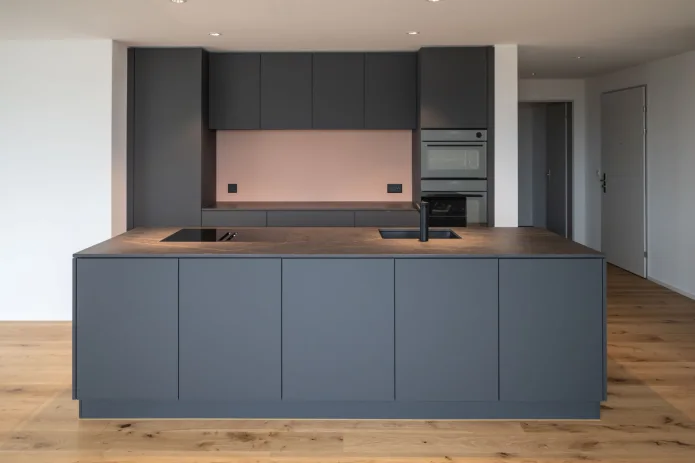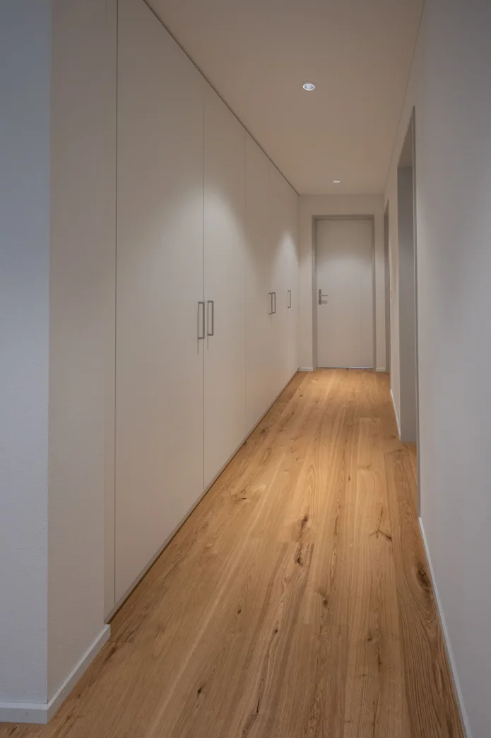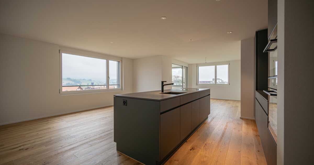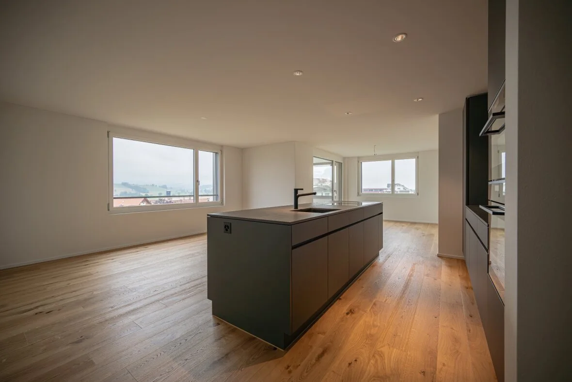Der verglaste Balkon bietet eine unverbaubare Aussicht und lädt zum Verweilen ein. Die offene Küche mit Kochinsel begeistert Hobbyköche, während Reduit und Einbauschränke für viel Stauraum sorgen.